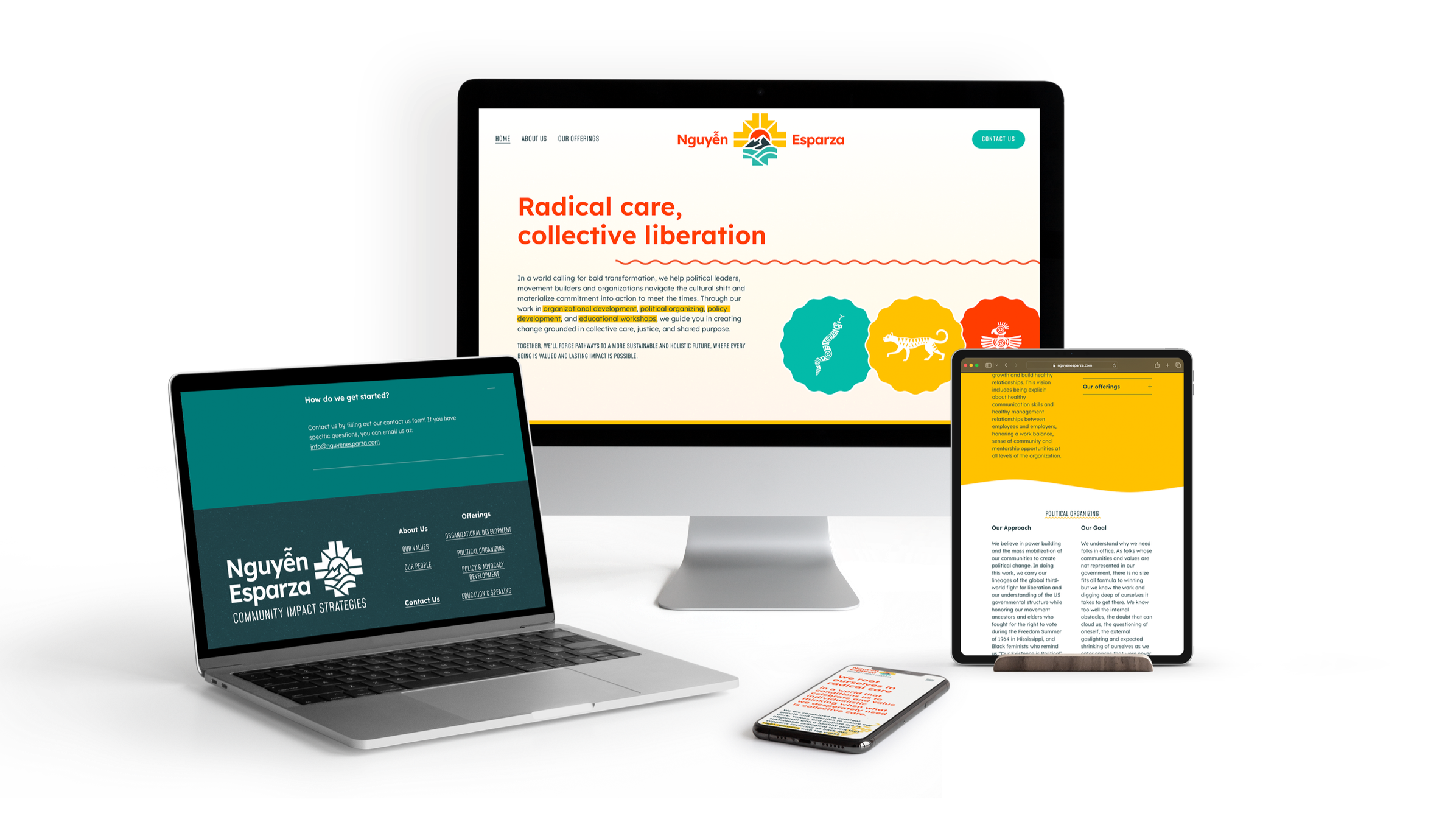 Nguyen Esparza Community Impact Strategies is a collective of consultants and community change-makers committed to radical care and collective liberation. They wanted a clean, engaging brand and website that effectively shares their origin story and offerings. The logo is inspired by their guiding compass, the Chakana (Andean cross), and their brand features illustrative patterns and images of the Chakana’s three sacred animal spirits: the cóndor, puma and serpent.