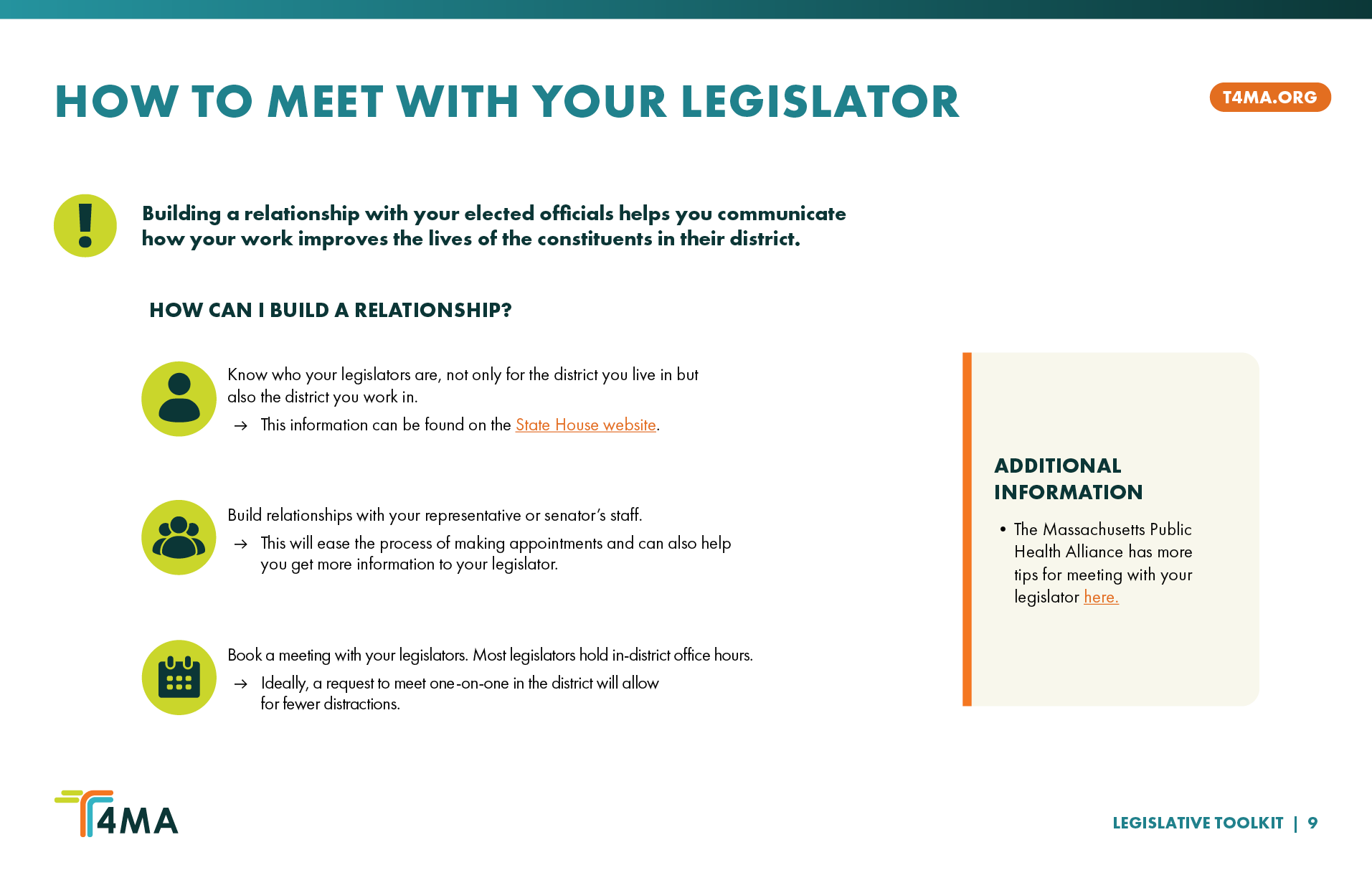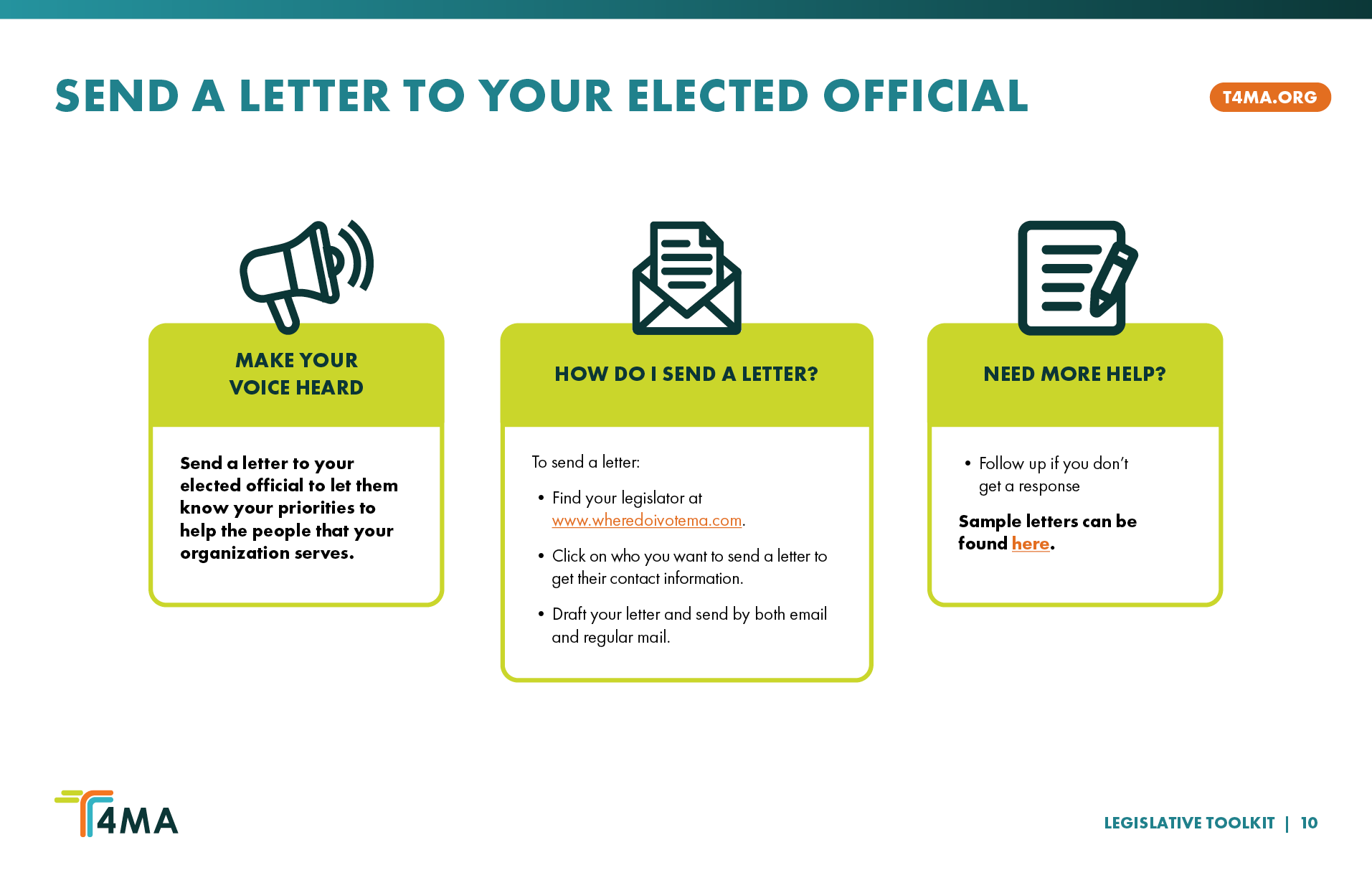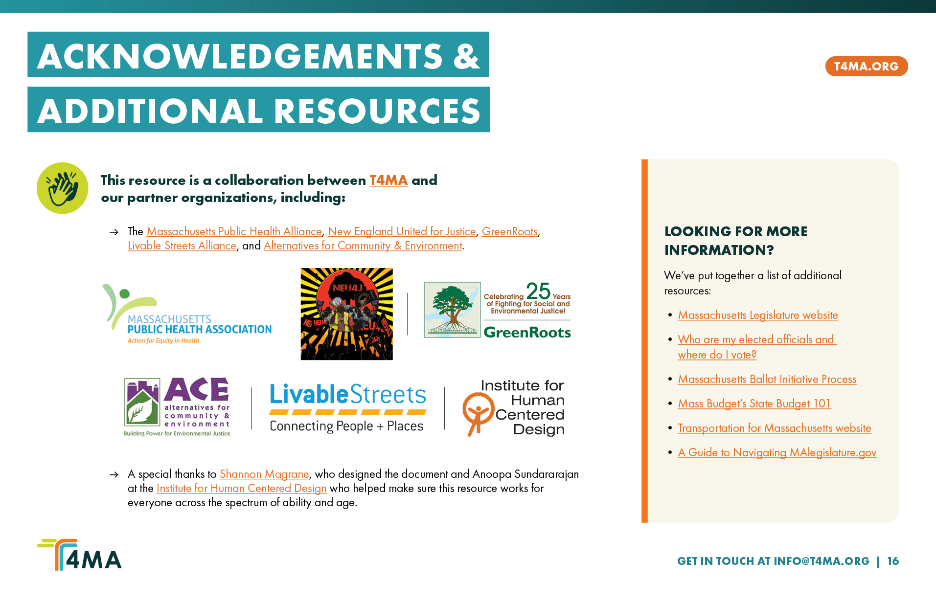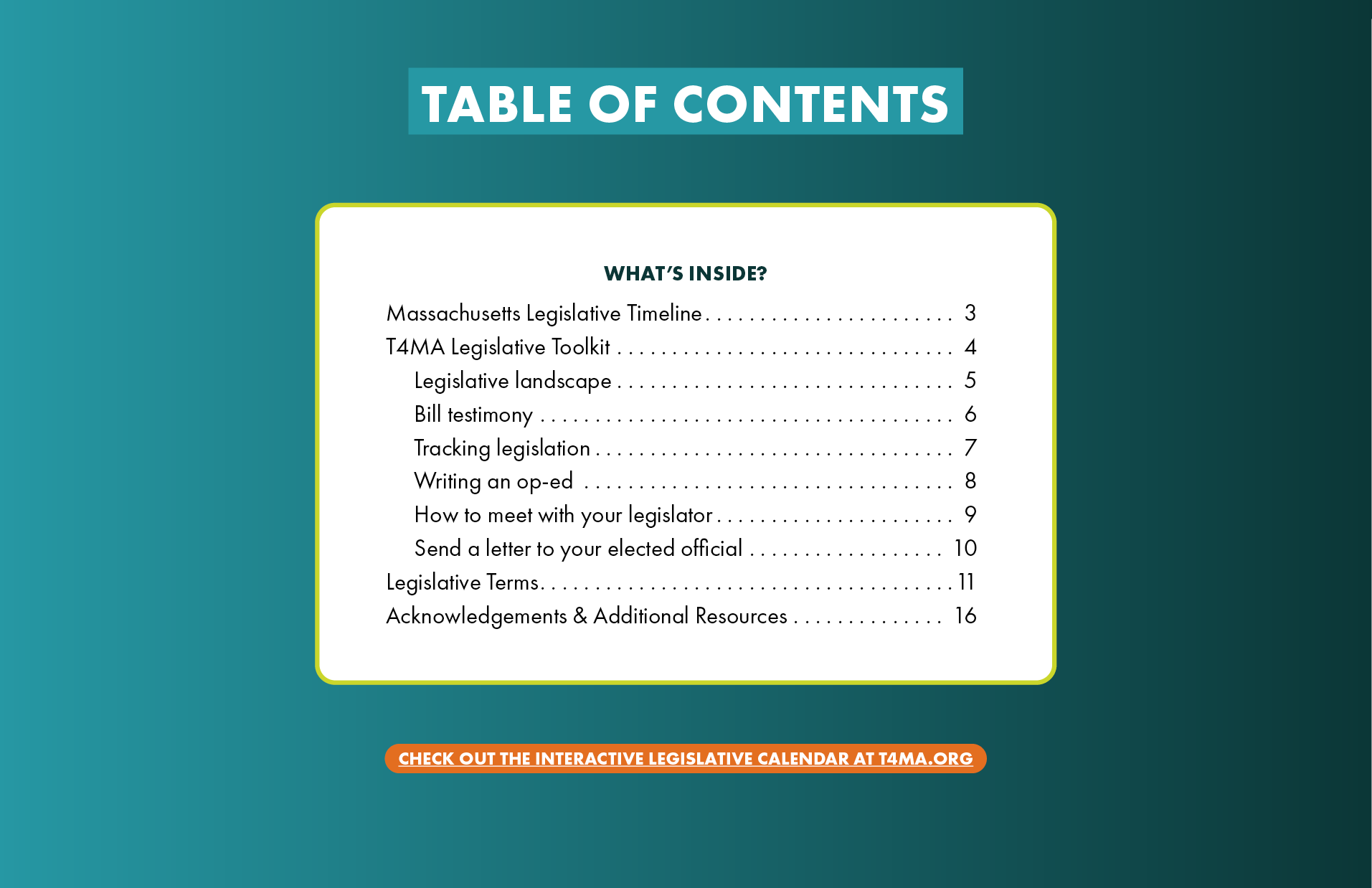 Transportation for Massachusetts (T4MA), established in 2010, is a statewide coalition focused on improving Massachusetts’ transportation systems. T4MA is committed to addressing the decades of inequitable transportation policies adversely impacting low-income, working class, Black, indigenous and communities of color. Their coalition advocates at the federal, state, and local levels for transportation policies that are just, safe, reliable, accessible, equitable and affordable. With their advocacy and values in mind, T4MA wanted an actionable toolkit and interactive calendar to better engage their partners and members with policy priorities.